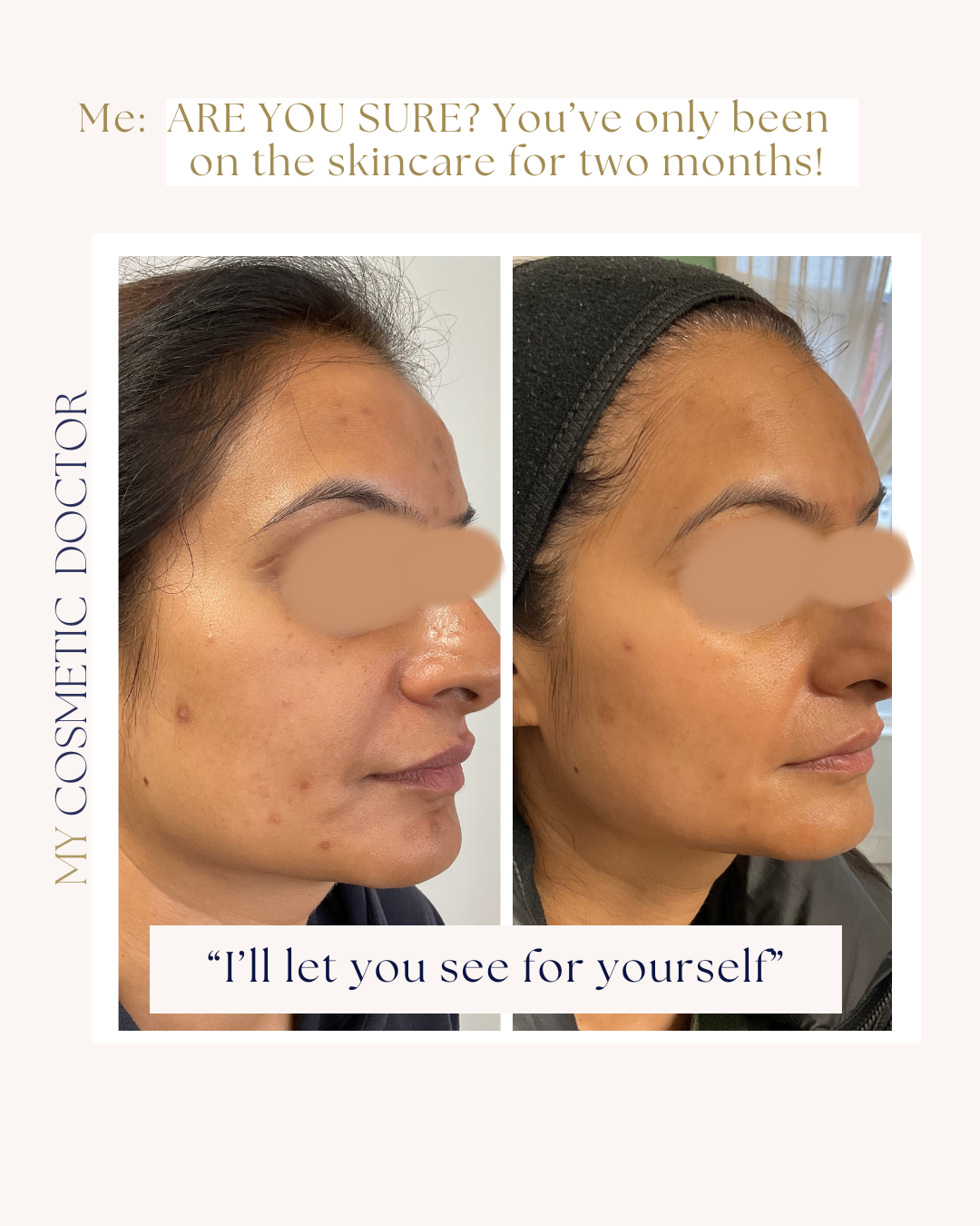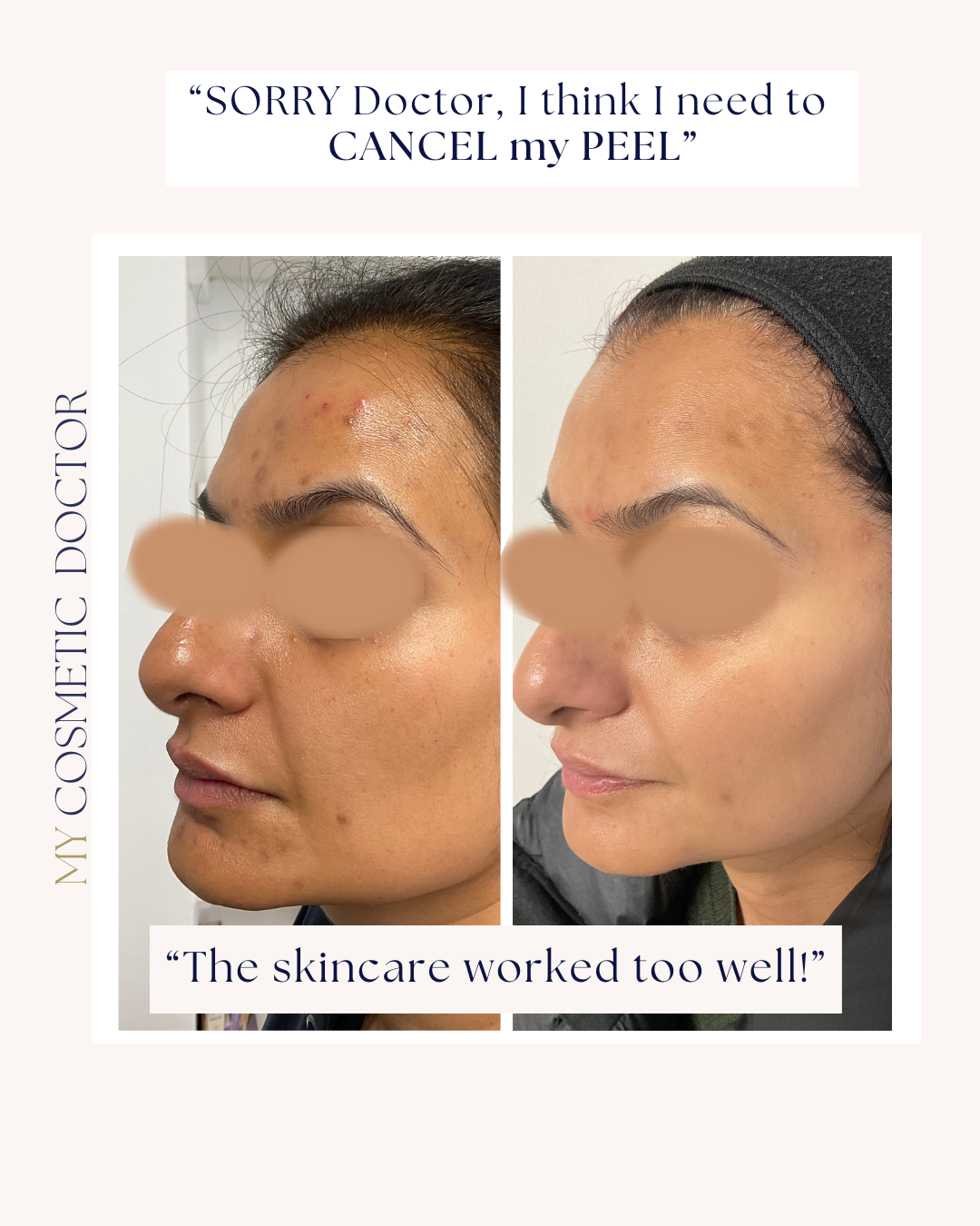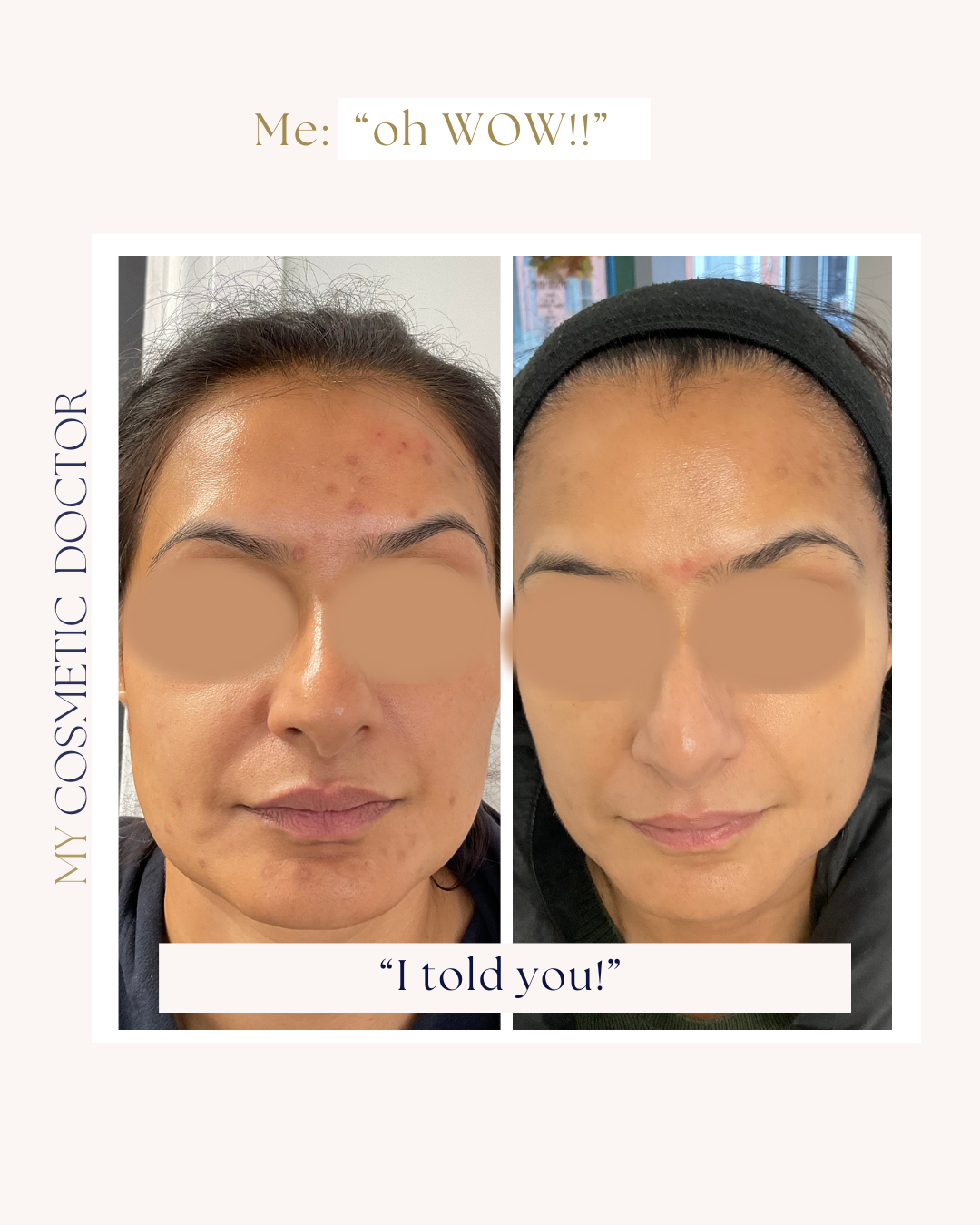 Outcome: Her improvement was so significant that she cancelled her chemical peel appointment — the skincare alone delivered results she never thought possible. You can see her result below by scrolling through the photos.